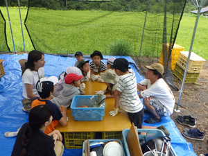 こちらは釣竿を作って釣りに行きました。みんなでおしゃべりしながら糸を垂らします。中々釣れないけど、それはそれで楽しい様子。