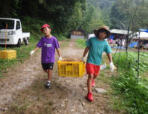 チャレンジコースは薪置き場が少し離れた場所にあるので、みんなで協力して運びます。