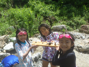 木の板に石を乗せて、船のように川で流して遊んでいました。自然のもので遊びが生み出せます。
