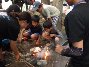 次は、ごはんづくり用のもみぎり式での火起こしです。力が必要なので、みんなで交代しながら火を起こします。