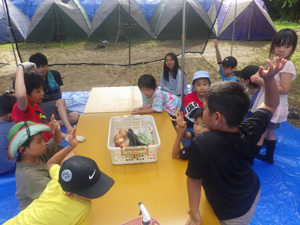 生き物を探していたら、なんとカニを発見。キャンプではたくさんの生き物との出会いがあります。