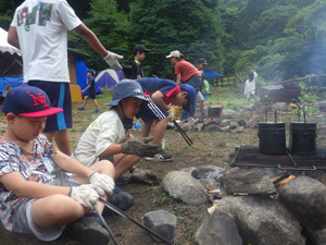 火がついたら、じっくり火の様子を観察して慎重に薪をいれていきます。上手にご飯ができるかな?