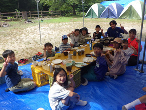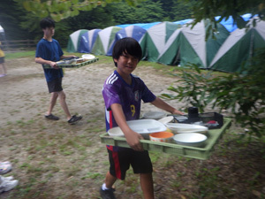 食べた後は片付けです。「早く川で遊びたい!」と片付けが早く終わるように、みんなが洗った食器をまとめて運んでくれました。