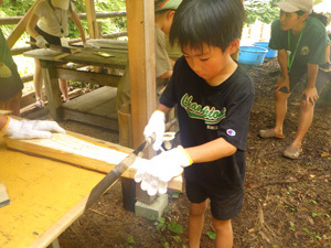 工作では自分が作りたいものをイメージしながら、木や竹を使って自由にものづくりを楽しみました。