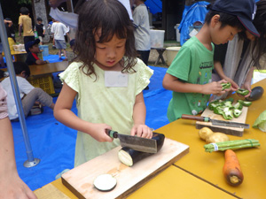 集中して丁寧に食材を切っていきます。この大きなナスも、アスパラやピーマンも泰阜村の農家さんが作った新鮮なお野菜なのです。