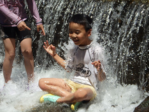 川遊びではやりたいことに出ていた「滝にうたれる」をやってみました。冷たい水が気持ちいい!!