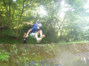 川の飛び込みにチャレンジ!何回も飛び込んでいました。