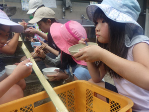 山から竹を切り出して流しそうめんをしました。苦労して作った流しそうめん台で食べると美味しいね!