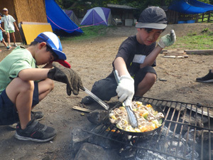 一人では大変な直火での調理も仲間と協力して作ります。「押さえてるから今のうちに炒めて」「オッケー」仲間の存在が頼もしい。