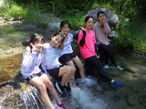 冷たい川に腰かけてハイチーズ!一緒に遊ぶとより一層仲良しになります。