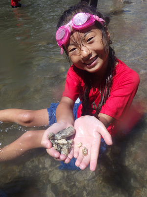 「きれいな石見つけた!」河原の石に大興奮。よく見ると中にキラキラした石やきれいに色が分かれている石が。些細な面白いものを見逃さない。こどもたちは発見の達人です。