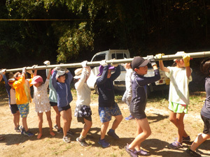 流しそうめん用の大きな竹をみんなで運びます。中には身長が届かずぶら下がりそうな子も(笑)。でも一緒に運びたいんだよね!