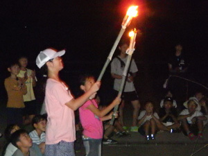 ベーシック8組は台風の関係で、みんなで計画できる夜は1日分でした。でもどうしてもキャンプファイヤーと肝試しがやりたいと考えた「キャンプファイヤー肝試し!」まずは点火式で火をつけます。
