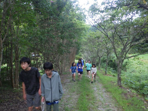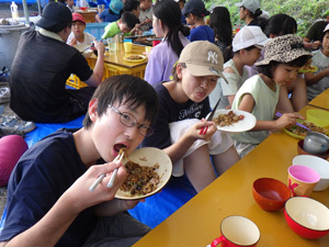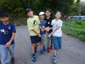 チャレンジコースでは水くみが日課です。食器洗い用の水は川の水を使います。