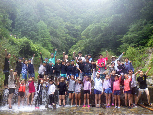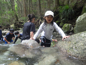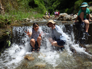 沢のぼりに出かけました。森の中を流れる左京川をみんなで協力して登りました。