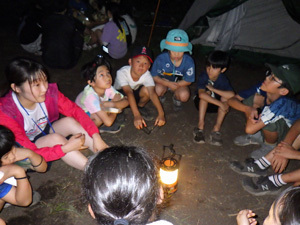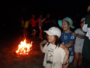 夜はキャンプファイヤーでじゃんけん列車やもうじゅう狩りをしてあそびました。