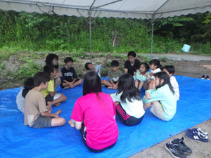 最後に族で集まってキャンプのふりかえりをしました。いっぱい遊んで働いて、思い出がぎゅっとつまったキャンプになったね。また会おう!