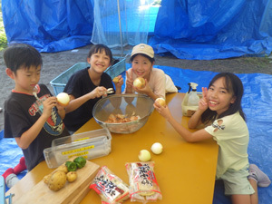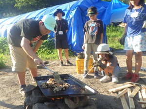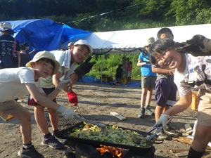 最後の夜ご飯づくり。この後はキャンプファイヤーが待っている!早くご飯ができるようにみんなで協力して炒めます。