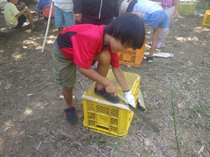 工作ではノコギリや小刀を使って自由にものを作ります。さあ何ができるかな?