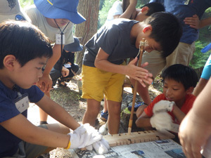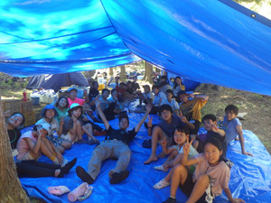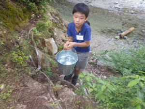 手洗いや食器洗いは川の水を消毒して使います。みんなで協力してバケツリレーを頑張りました。