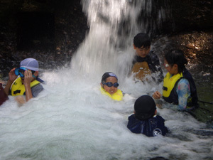 フィールドの近くを流れる砺中川で遊びました。滝つぼ遊びが人気でした。