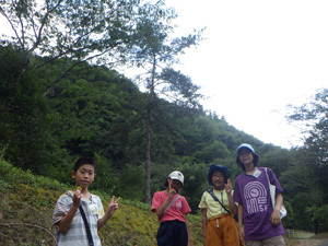 やりたいことに出ていた「山登り」に出発です。後ろの山のてっぺん目指して歩きました。