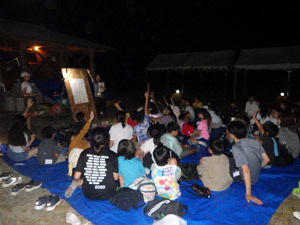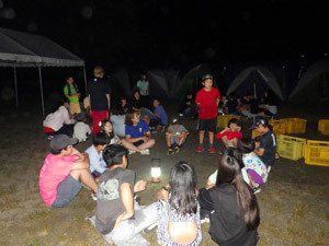 夜はキャンプファイヤーをしました。実行委員のこどもたちが企画したハンカチ落としや爆弾ゲームなどを行い、大盛り上がりでした。