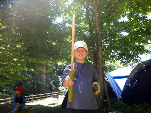 工作ではキャンプ場にあるものを使って自分が作りたいものを作ります。木と竹を組み合わせてオリジナルの剣が出来上がりました。