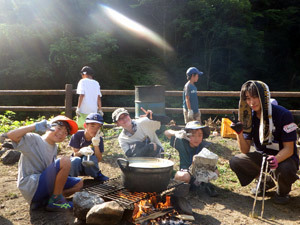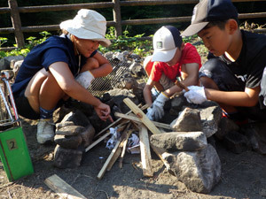 山賊キャンプのご飯は自分たちでつくる!かまどの準備も大切な仕事です。石でかまどを組んでどうしたら火が起きるのか考えます。
