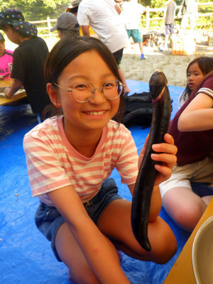キャンプで使う食材のほとんどは村の農家さんが作ってくれています。とれたてとっても長いなすび。いったいどんな料理のなるのかな?