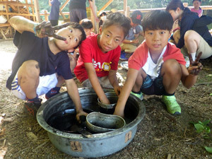 ご飯の後はお片付け。山賊キャンプは仲間と協力すること場面がたくさんあります。だからどんどん仲良くなっていくのです。