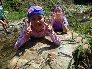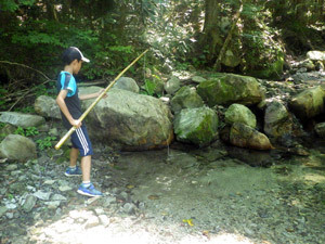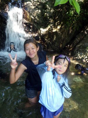 おなか一杯になったら遊びに行こう!暑い夏だけど、川の水はとっても冷たい!水につかって、滝に打たれて、気持ちいい!