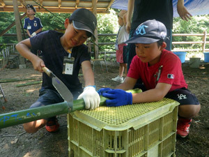 採りたての竹で、流しそうめんも夏の風物詩です。とっても暑いけど、暑いからおいしい!水の流れを見ているとなんだか涼しい気持ちになってきます。