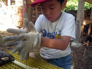 工作では竹を材料に竹トンボや名札づくりに熱中しました!