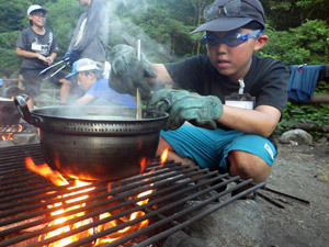 ごはんづくりが始まりました。ちょうどよい大きさの火がおきました。