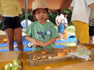 包丁チームでは、野菜をできるだけ薄く切って火が通りやすくなるように頑張りました。