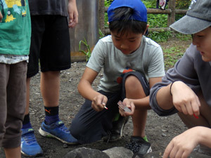 生き物探しをしていたら、オタマジャクシからカエルに変化する途中のオタマカエルを発見しました。