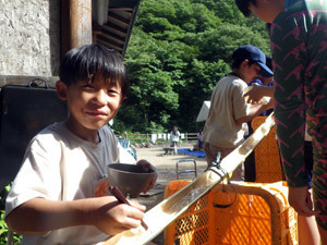 竹を割って作った手作り流しそうめんをしました。つるつるとおいしそうに食べていました。