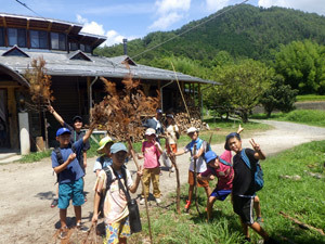 アジトの近くにある大峰山に登山に行ってきたこどもたち。帰ってきた手には、大きな枝に、たくさんの松ぼっくり。聞くと「夜ごはんの火起こしに使う!」だそうです。遊びながら暮らしのことを考えるなんて!もうすっかり山賊です。
