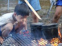 「食事は自分たちでつくる!」のおきて通り、朝・夕の食事作りは自分たちで協力して作るよ。もちろん薪を使って火おこしからはじめるんだ!みんなで作ったご飯はおいしいよ!