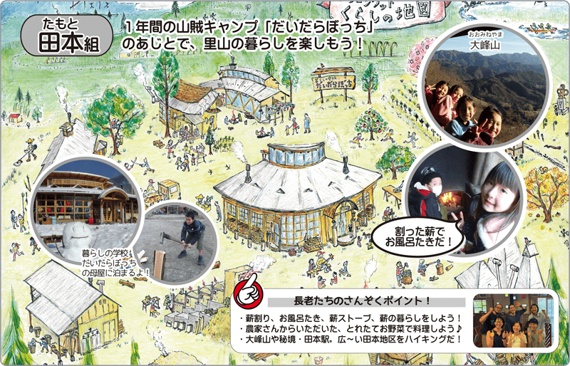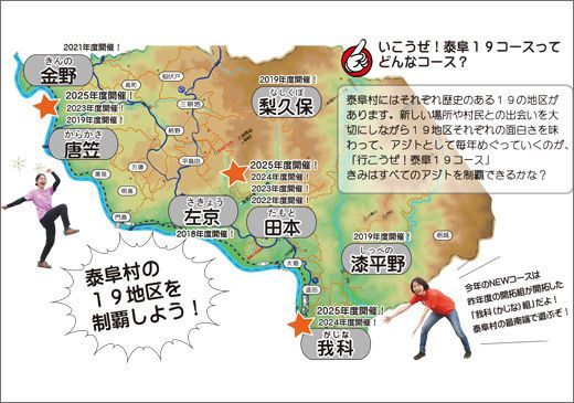 泰阜村内19地区にある、19か所のアジトの中から毎年どこかをめぐって、泰阜村の魅力を堪能・発見するコース!今年はその中の3地区のフィールドでキャンプを開催するよ!