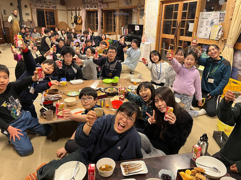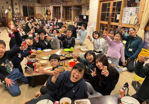 ※伊那谷では、12月31日から1月1日のことを「年こし」とは言わずに「年とり」と言います。その昔とっても貧しかったこの山村で、おおみそかの夜だけは「尾頭付きの魚」を食べて、家族全員で新しく年をひとつとったのです。その風習が今でも息づいており、このキャンプではその「お年とり」を体験します。