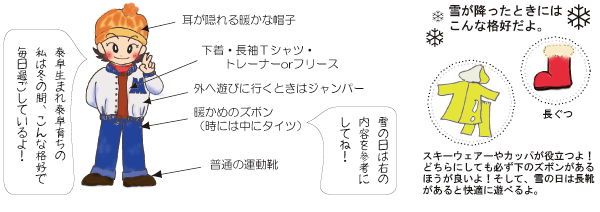 雪が降ったときにはスキーウェアーやカッパが役立つよ!どちらにしても必ず下のズボンがあるほうが良いです!そして、雪の日は長靴があると快適に遊べます。