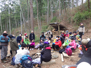 唐笠組の目玉、森の拠点にやってきました。まずは森を見渡して何をして遊びたいか、危ないことや活動範囲について話してから遊び始めました。