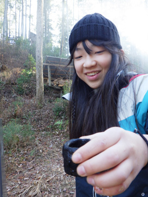 穴掘りチームが粘土を発見!森の中に流れる小さな沢の水を汲んできて、土と練り合わせて器の形を作り、焚火で焼きものを作りました!かっこよい仕上がりに大満足でした。