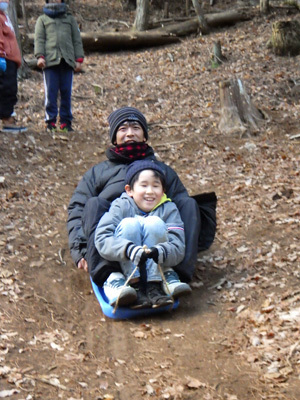 ソリ滑りチームは森の色々なところで滑りを確かめ、一番楽しいコースを見つけました。疾走感がたまりません。