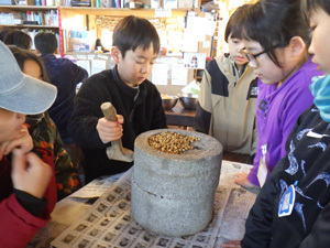できたてお餅のトッピングにきな粉も石臼で挽きました。周りにはきな粉のとてもいい匂いが漂っていました。