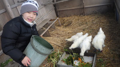 暮らしの仕事、にわとりの餌やりです。野菜くずなどを食べてくれるにわとりも大切な暮らしの仲間です。